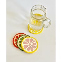 So much fun! Add a splash of color to your surface with a set of fresh citrus coasters. Cork feet on the back to protect your surfaces.